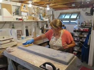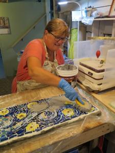 Once the slab in the garage was cured (3 days), I moved it to my studio in the basement where we could work on the mosaic surface. It took three hours of a coordinated approach with Monica working ahead of me laying down a layer of thin set mortar as I followed behind placing the pieces from the pattern layout onto the slab. It was intense! She was a master at keeping me on task.