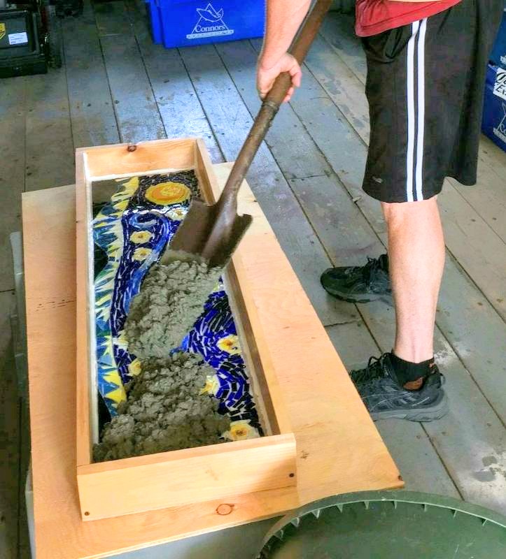 We moved the operation to the garage where I used Quik-Crete cement mixed fairly wet for the pour. It took 1.5 bags (30 kg each). I also added two 1/4″ steel rods for strength. This particular cement has a lot of rocks in the mix so we debated whether or not to use it. The fear was we wouldn’t get a smooth tight finish around the glass pieces. Nevertheless, I continued with a fool’s confidence.