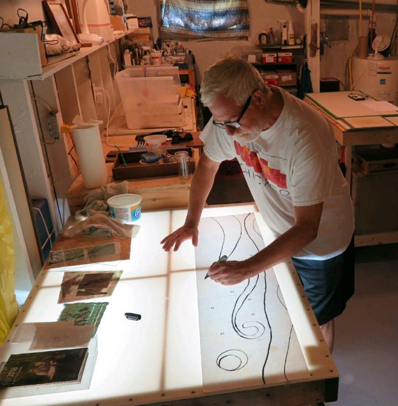 In the studio, I created the full sized pattern on plain paper. Then, with the help of the light table, traced onto the reverse side with black marker.
