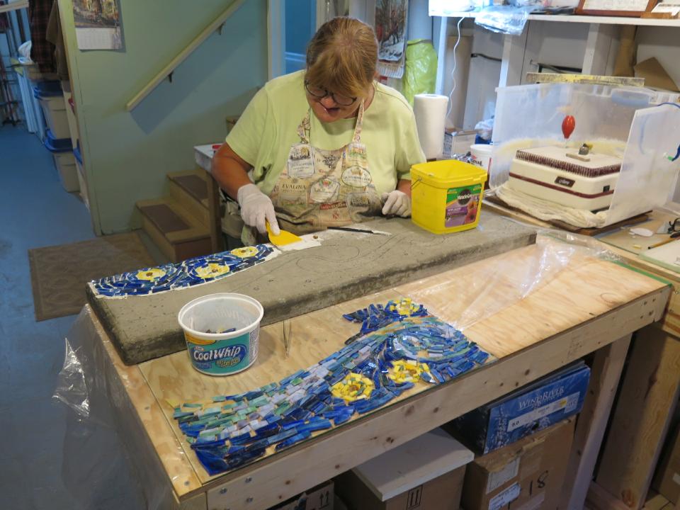 24 hours later, we laid down the surface grout and smoothed it off with a sponge trowel and sponge wash. Monica worked along beside me, neither of us able to stop lest the grout should start to set… except to snap the occasional photo. 😁