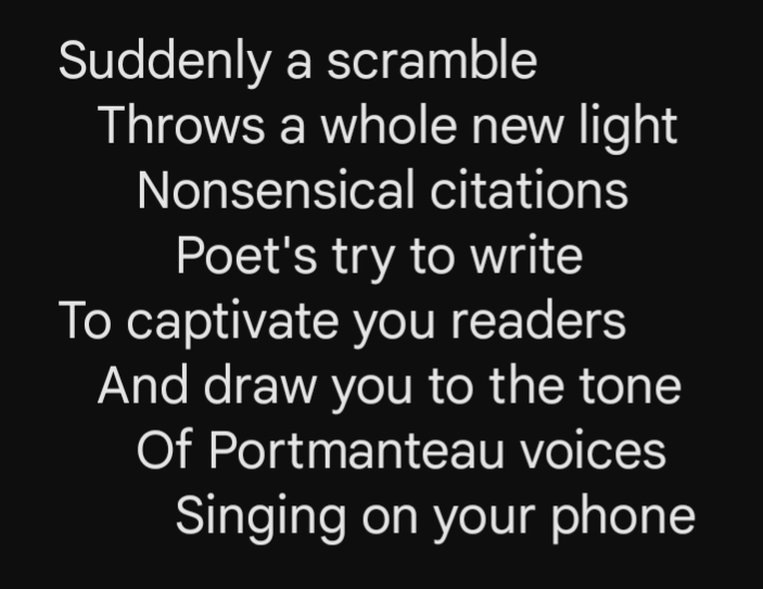 Poet’s Note: “Portmanteau” is a word made-up by combining parts and meanings of two or more other words. My interpretation doesn’t exactly fit the true meaning, but it’s close.