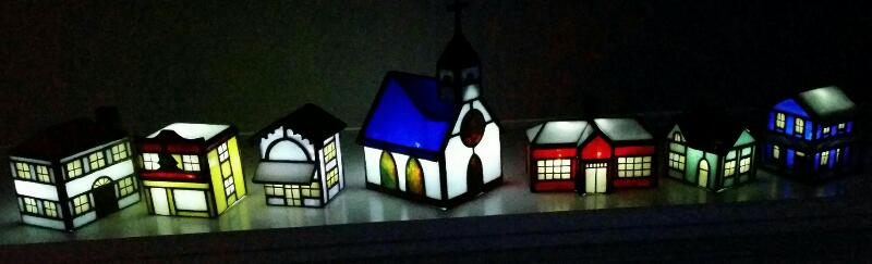 What a fun project. I learned more about 3-d construction each time I made a new one. Once completed, it looked real cute on the mantle with tea lights set under each house.