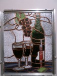 My first commissioned piece… a small panel for our good friend Yogi’s birthday (Maneau’s mom). A bottle of wine and two glasses with hanging grapes. I searched Google images for a suitable design. This one looked perfect. 100 pieces in total with the smallest (about 0.5 cm) being along the top edge of the wine in both glasses. The label on the bottle is a peculiar design and I debated changing it but decided to stay with the original. It does make an interesting contrast.